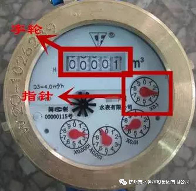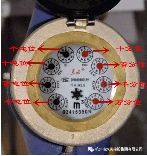 指针式水表中一般红色指针表示的是小数位,黑色指针表示的是整数位,红指针先不要管它,从黑色指针的“×1000、×100、×10、×1”开始看起,分别是千位、百位、十位和个位。读法也是每档逢小读,千吨位的指针在0-1之间,则读数为0。同理,百吨位为700,十吨位为60,个吨位为8,整数位相加得到768吨。